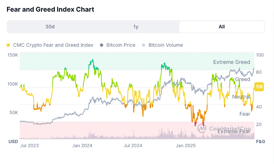 Market sentiment is strengthening rapidly, with CoinMarketCap’s Fear and Greed Index now at 59, signalling a move from neutrality toward greed. When this happens, wealth often flows from established assets like Bitcoin and Ethereum into smaller, more volatile tokens – especially meme coins.