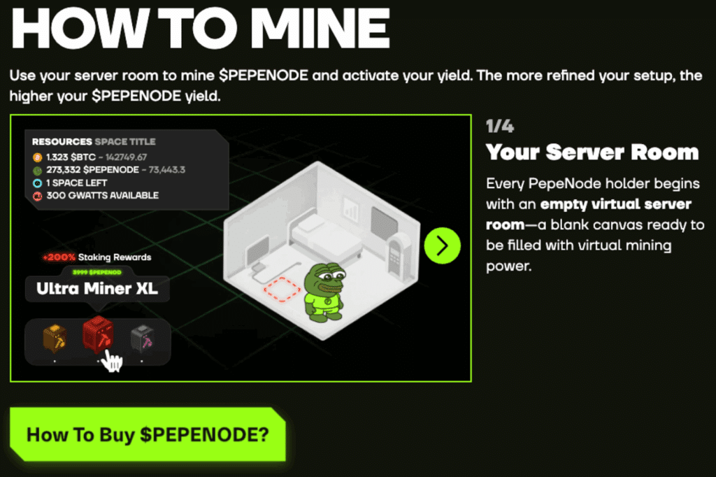 The concept is simple: players start with an empty digital server room, purchase nodes using PEPENODE tokens, and upgrade them to boost their virtual mining power. The more efficient the setup, the greater the rewards. This transforms mining from an energy-intensive competition into a game of strategy and optimisation.
