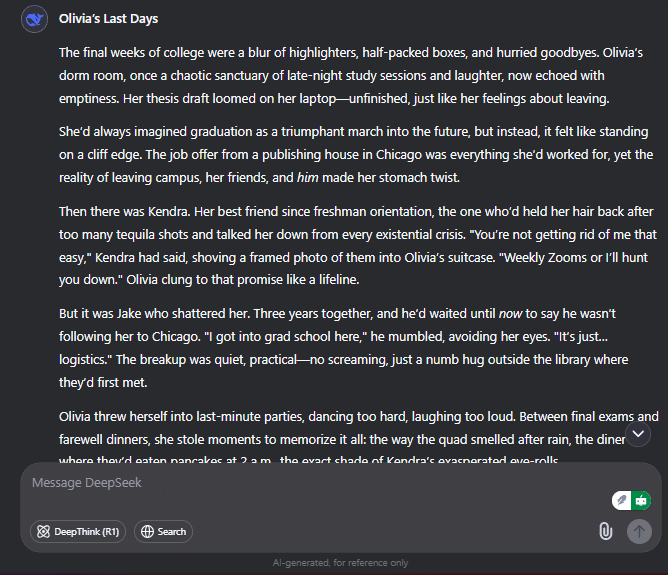 | 10 | Image generation | ChatGPT outperformed DeepSeek in generating a book cover. It created an image, while DeepSeek only offered a text description and couldn’t generate an image. |