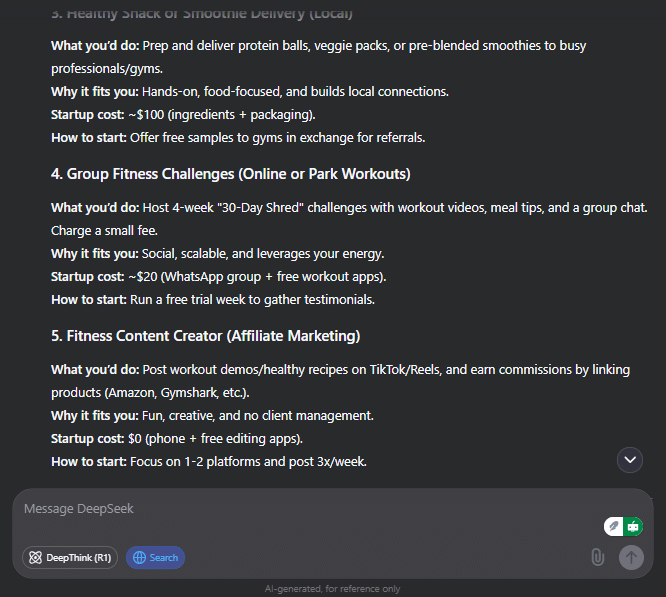 | 5 | Idea generation | DeepSeek and ChatGPT both understood the prompt. However, DeepSeek stood out by offering more detailed, practical suggestions, including estimated startup costs, how to get started, and a tip on which idea to try first. |