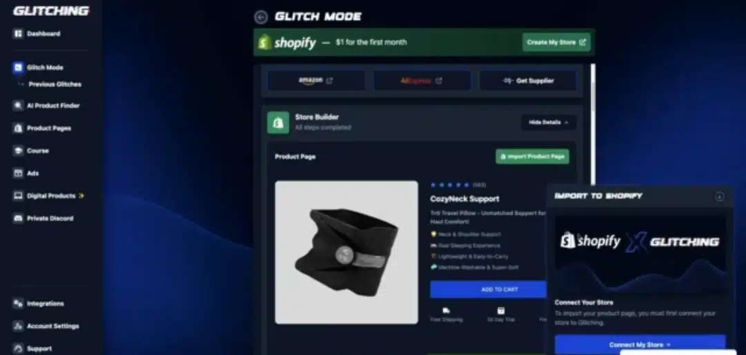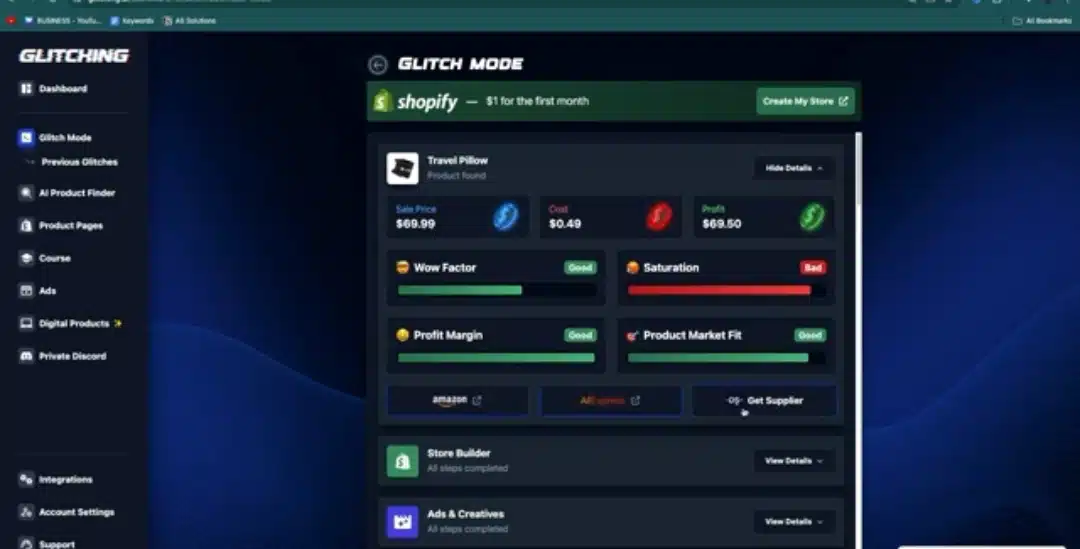 Glitching AI is an all-in-one AI solution that recommends trending products, auto-syncs with suppliers, and even tweaks your ads based on real-time data. Slick, right? But here’s what I wondered: Does this actually “work,” or is it just another bot churning out white lies but charging $19.99 per month?