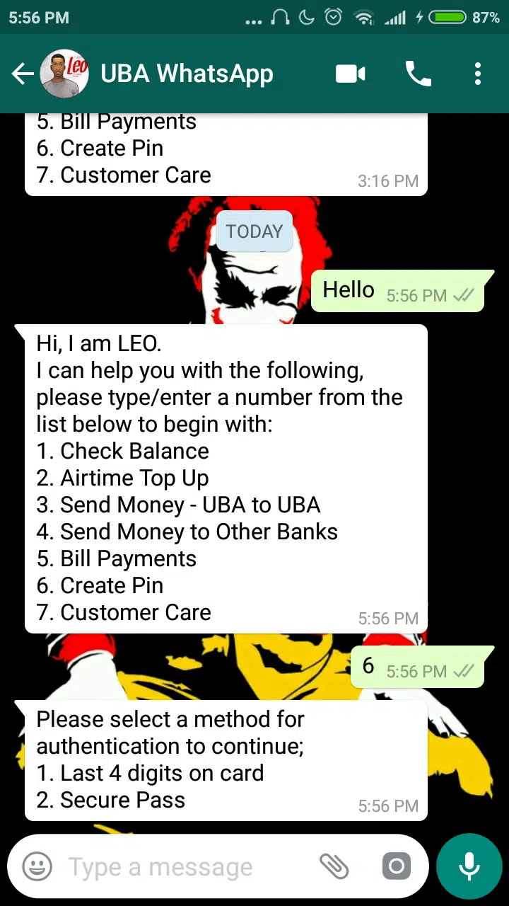 Using UBA on WhatsApp, you’ll be interacting with Leo, its Chat Banker